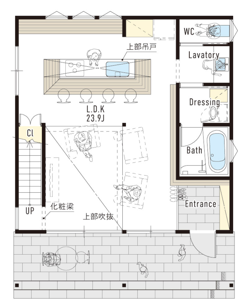 親しい人たちを招いてお茶会や食事会など、さまざまなシーンに対応可能なクラシカルなスタイルの家です。テラスによって室内外がゆるやかにつながり、アイデア次第で色々な楽しみ方が可能に。開放的な空間はコミュニティの中心になることが期待できます。軒は出さずにすっきりとした三角屋根と南面に大きく開放された窓が特徴です。奥行のあるリビング前のテラスが内と外をゆるやかにつなぎます。